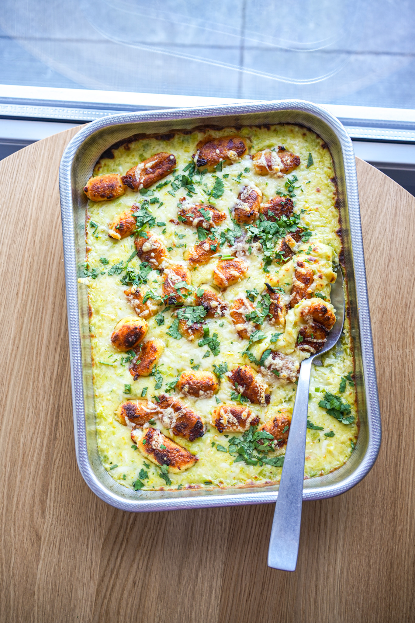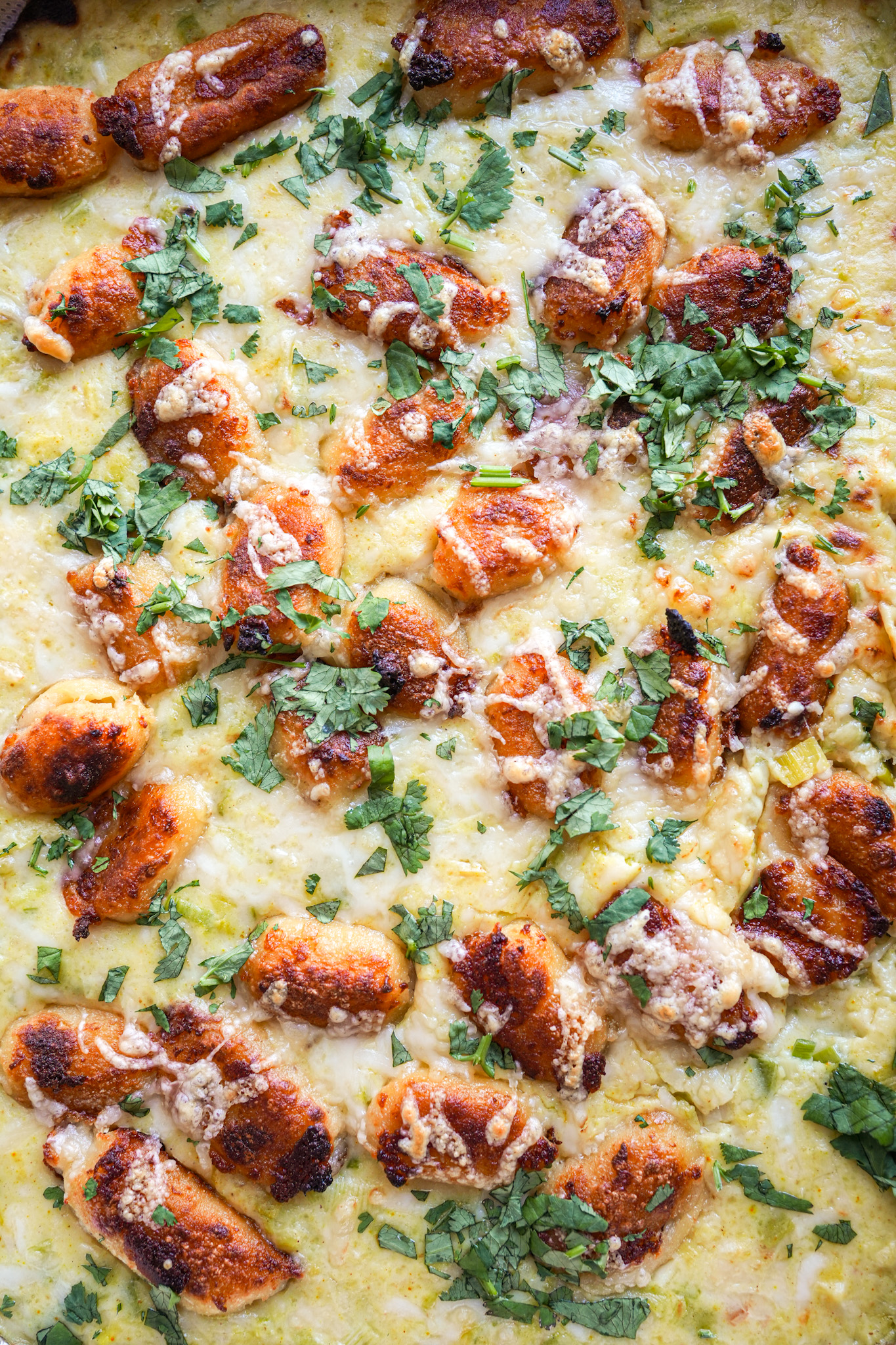 Versez la sauce aux poireaux dans un plat à gratin, dispersez les gnocchis par dessus puis parsemez du reste de fromage râpé. Enfournez quelques minutes jusqu’à ce que le dessus du plat commence à colorer. Parsemez de coriandre hachée juste avant de servir.